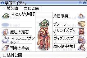 | 銀の懐中時計[0]・[1] | アクセサリ | 特になし | 銀の懐中時計、古代の魔法 [2] or 魔法の定石 [2]、司書の手袋を装備時、Int+5 MHP+700 ASPD+5% 銀の懐中時計、メモライズブック、片目眼鏡を装備時、MATK+7% HPSP回復力+15% |